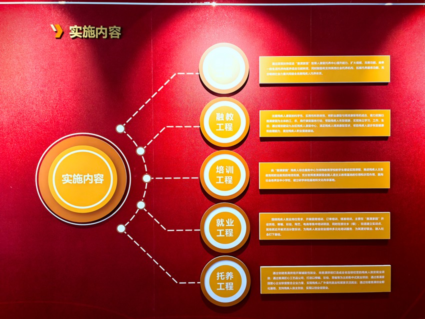 自融创模式开展以来,累计开展残疾人职业康复2500余人次、学龄段融合教育150余人、职业培训5700余人次、集中安设就业450余人、孵化残疾人企业27家、80多家爱心企业成立善满家园意愿者联盟供给就业办事2000余人次。曾经有50余人回归社会加入工做,还有48名智障人糊口正在托养核心。